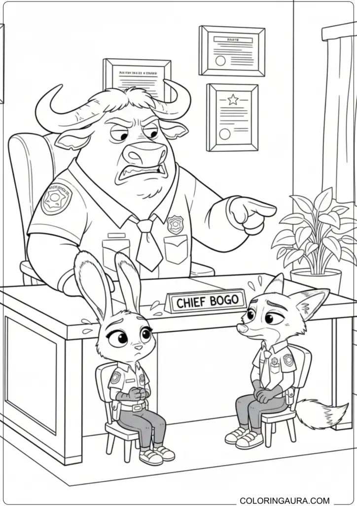Zootopia coloring page featuring Chief Bogo scolding Judy Hopps and Nick Wilde in his office.
